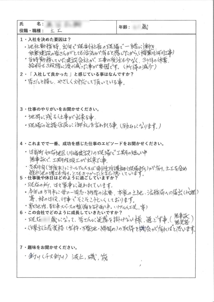 ・当時勤務していた建設会社が、工事の受注も少なく、3ヶ月の休業、給与も3段階にわたって減ったこともあり入社を決めました。